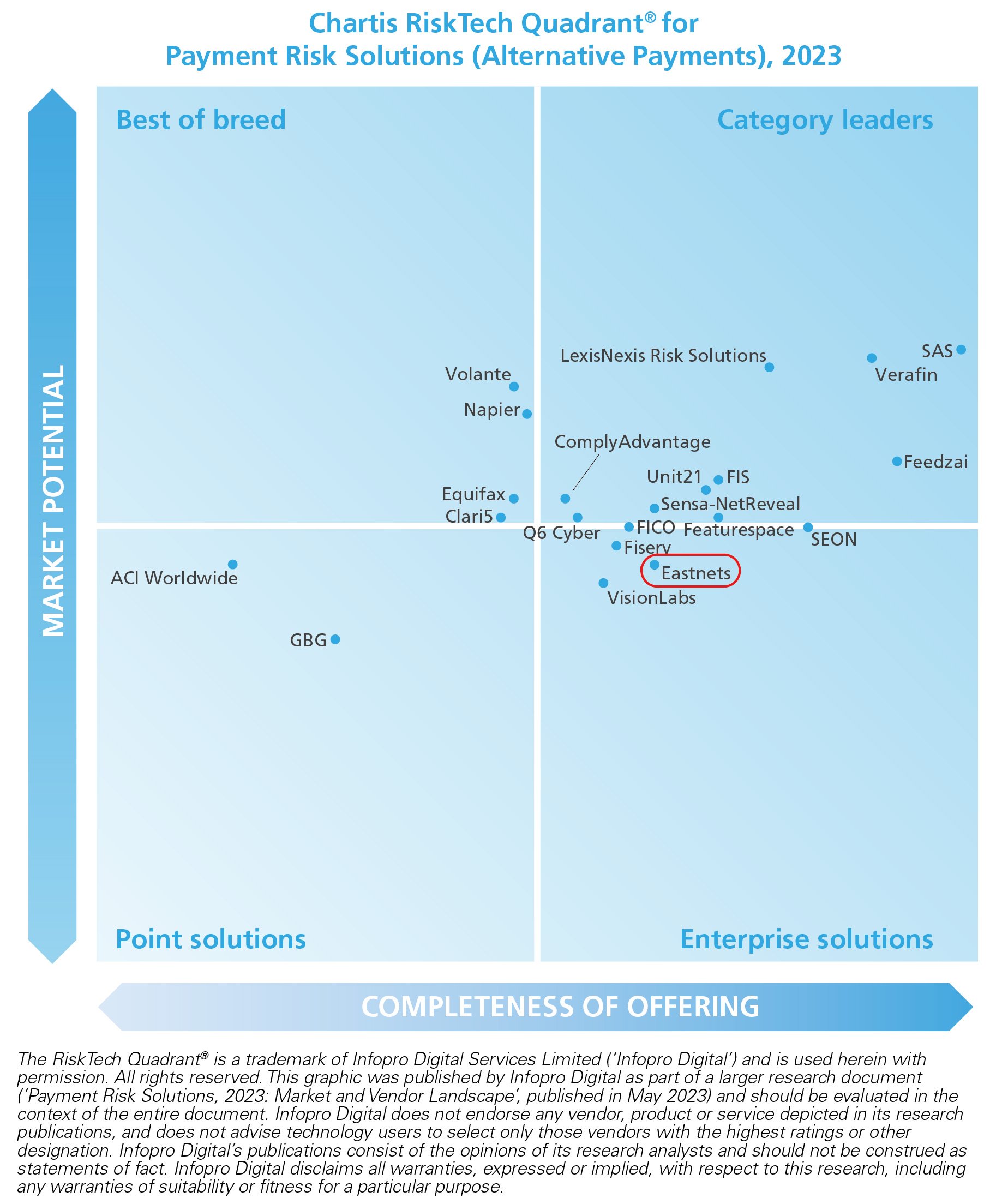 Eastnets, a global leader in compliance and payment solutions for the financial services industry, has achieved “Category Leader” status in the Chartis Payment Risk Solutions 2023 report. Eastnets also ranked as an “Enterprise Solutions” provider for the Alternative Payments quadrant.
